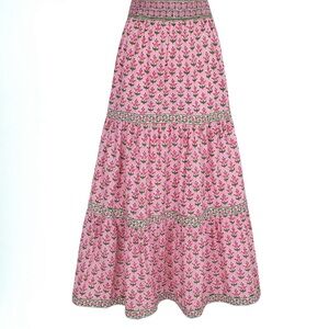 Block-printed by hand in the feminine Rose Hyacinth floral, the Lucia skirt adds a pop of color to any outfit. With an intricate, border waistband, pretty gathered tiers, and a flattering A-line silhouette, this maxi pairs perfectly with the matchingRose Border Lucia Top or a simple white blouse.