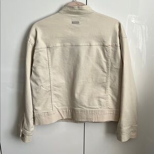 Elevate your style with this chic beige oversized cotton jacket. Perfect for any occasion, it offers both comfort and elegance. Features 2 front large pockets, button closure along front and on arms. Mandarin style collar and band on waist fits larger. Stretch cotton blend. New without tag.