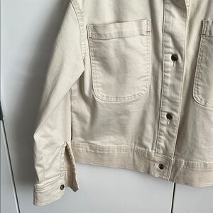 Elevate your style with this chic beige oversized cotton jacket. Perfect for any occasion, it offers both comfort and elegance. Features 2 front large pockets, button closure along front and on arms. Mandarin style collar and band on waist fits larger. Stretch cotton blend. New without tag.