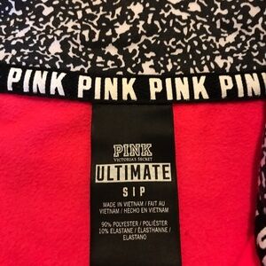PINK Victoria’s Secret Ultimate women’s athletic half zip long sleeve top in bright neon pink with black and white contrast lining inside the collar. Features black trim along the zipper and sleeves and built-in thumb holes. Smooth stretchy performance fabric that layers well and holds its shape.