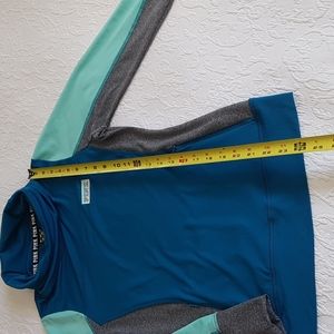 Teal color body, light green and grey down the sides and arms. Cowl neck; ties removed. Two zippered pockets in front. Stretchy fit. Keyhole thumb opening in the cuffs.