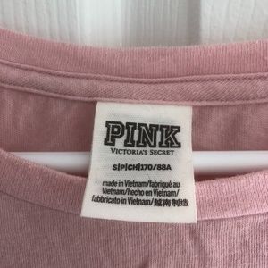 Light pink, black dog on the front, "PINK" in black on the sleeves