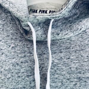 Add a touch of casual style to your wardrobe with this Victoria's Secret Pink gray and white hooded cropped sweatshirt. Made from a comfortable cotton blend material, this sweatshirt features long sleeves, a crew neck, and a relaxed fit that's perfect for any casual occasion. The white side stripe and hood add a trendy touch to this basic style sweatshirt.