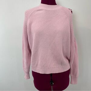 Light pink cotton waffle knit jumper from Pinko featuring a ribbed round neck, long sleeves, a ribbed hem and cuffs and a cold shoulder design at one arm with lace-up detailing.