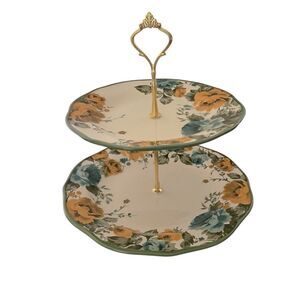 This beautiful 2-tiered Cake Stand is made from NEW matching Pioneer Woman Collection Rose Shadow plates, with gold-coloured heavy duty hardware. It features vibrant floral patterns and a subtly scalloped rim. It is a MUST HAVE gift for yourself or someone special!