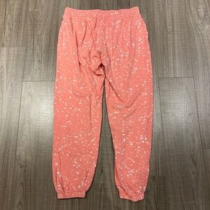 Cozy and stylish joggers in a fun coral / peachy-salmon with white splatter print. Features soft fabric, elastic cuffs, side pockets, and an adjustable drawstring waist. Perfect for lounging or running errands in comfort.
