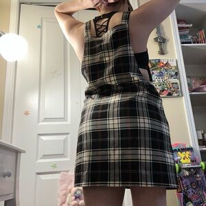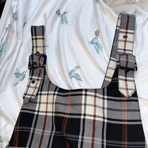 • beautiful red, black, white, grey plaid print midi dress, with overall style, 2 spacious pockets on front, and adjustable grommet belt style straps.