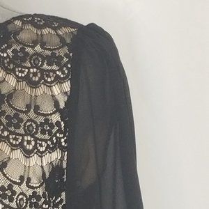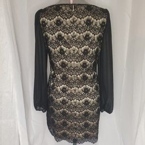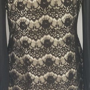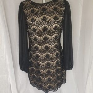 PLANET, 8, tunic style cocktail dress, nude with black lace overlay, sheer long sleeves, boat neckline, frayed hem. NWT