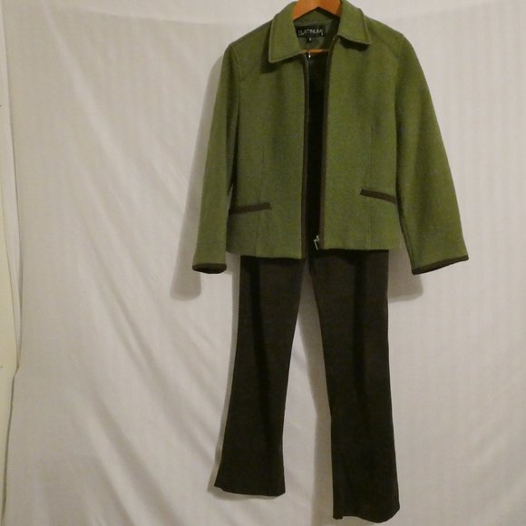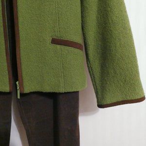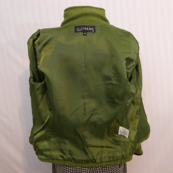 Fully lined Blazer Jacket by “PLATINUM” made of 100% wool in mint green with brown suede and zipper front closure.