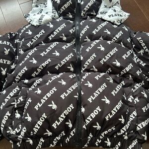 Playboy printed cropped hooded full zip Puffer winter coat. Like-new condition, no signs of wear