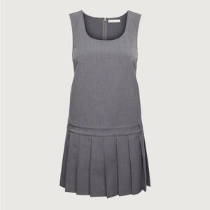 Recycled fabric blend. Scoop neckline. Back zip. Pleated skirt. Waist belt.