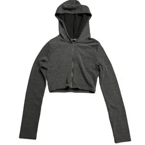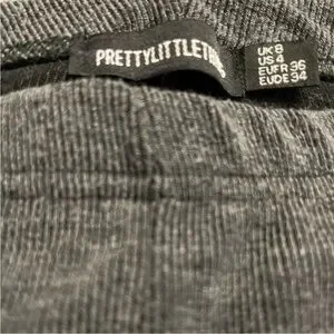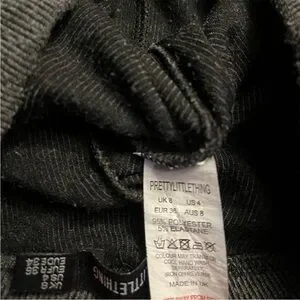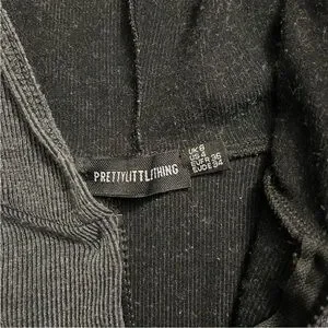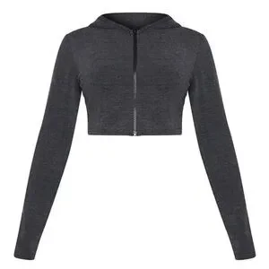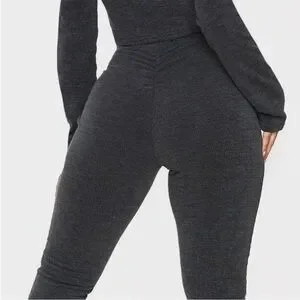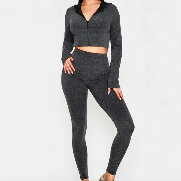 A two piece charcoal gray co-ord set from the PrettyLittleThing "Shape" collection. Includes a cropped zip-up hoodie and high-waisted leggings with a ruched bum detail. A flattering, curve-enhancing look for lounging or the gym.