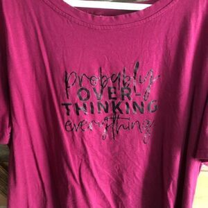 Burgundy short sleeve t-shirt with black graphic print 'Probably overthinking everything'