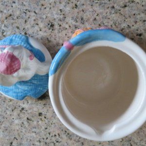 Cute sugar bowl featuring a mischievous white cat on lid, playing with balls of wool.