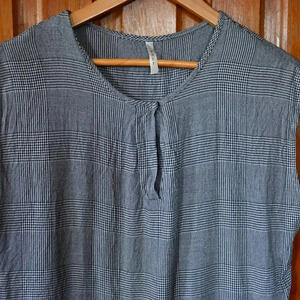 Black and white patterned top with short sleeves.