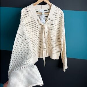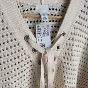 This cozy cream sweater from H&M features a stylish lace-up V-neckline and a relaxed fit, perfect for layering. Its chunky knit design and cropped length add a modern touch to any outfit.