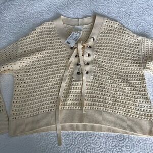 This cozy cream sweater from H&M features a stylish lace-up V-neckline and a relaxed fit, perfect for layering. Its chunky knit design and cropped length add a modern touch to any outfit.