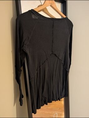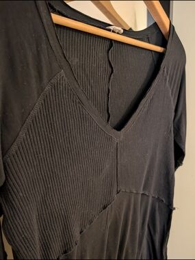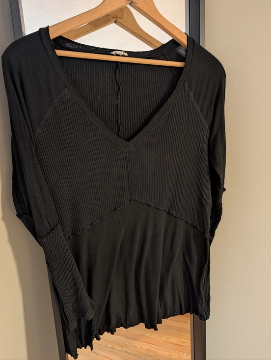 Lightweight black pullover with a V-neck. Ribbed paneling across the chest and sleeves. Soft drape and relaxed silhouette. Easy to layer over tees or tanks.