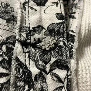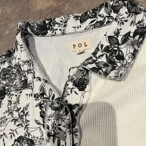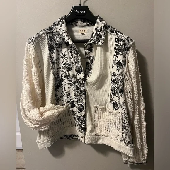 POL jean jacket with black floral print on a cream base. Mixed textures include knit panels and textured sleeves. Button-front closure and casual collar. Lightweight, versatile layering piece.