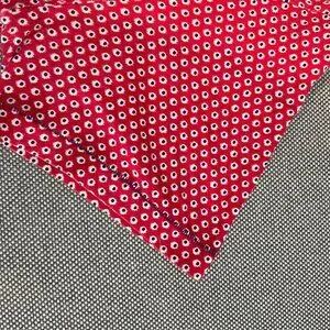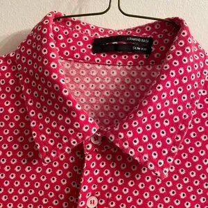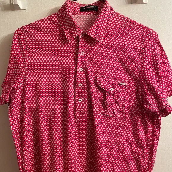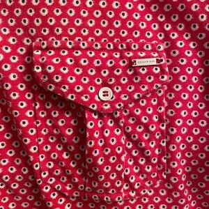 Short-sleeve polo shirt with a red base colour and white and navy dots. Five buttons from collar to chest and unique left pocket with button.