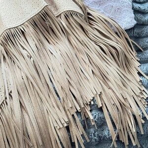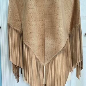 PONCHO, FAUX SUEDE, COLOUR: NUT, SZ ONE SIZE, LONG BOTTOM FRINGE, CAROLE GARBER at LES AILES DE LA MODE MONTREAL, TAG ON