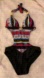 Cute monokini in excellent condition. Cuts in at the midriff, open back, highly padded bra, bright colors against black, lots of gold bling details! Care and label tag is missing, only size tag attached.