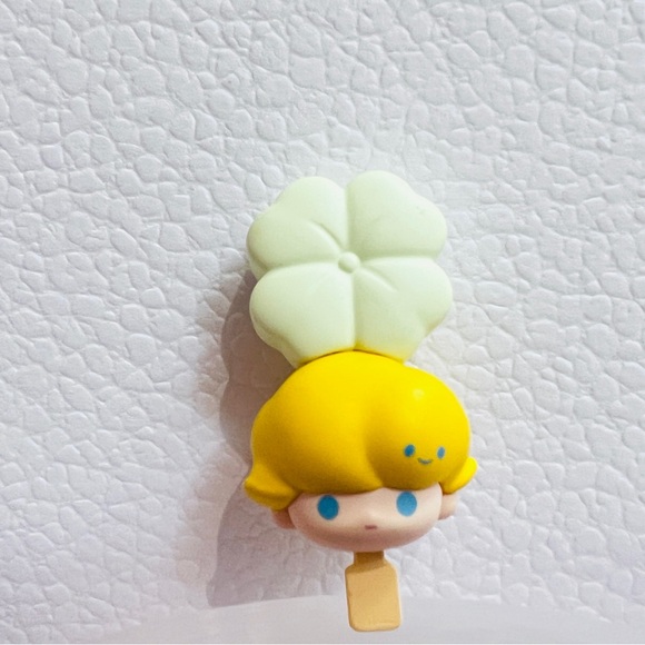Cute dimoo hair clip with mint green flower detail. Soft silicone material. Playful accessory for bags or hair.