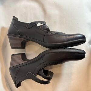 PORTOFINO Sz 41 Diagonal Straps Velcro Closure Leather Heeled Rounded Toe Shoes. Step out in style with these elegant black women's shoes. Perfect for any occasion, they offer both comfort and sophistication.