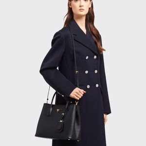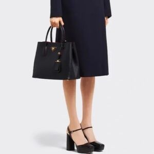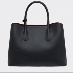 100% authentic Prada Large Double bag in Nero black Saffiano leather. Features double handles and a detachable shoulder strap, gold-tone hardware, a leather name tag with metal details, metal lettering logo on a leather triangle at the front and snap closure on the sides. Lined in Rosso Fuoco (fiery red) nappa leather with a flap pocket inside and lettering logo distinguish the bag. Has been worn and shows soft wear on the inside and corners. Overall in excellent condition.