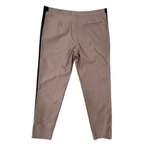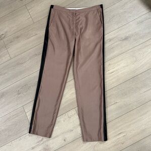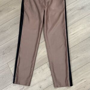 - Taupe/beige satin-finish fabric with a black grosgrain side stripe (often silk or cotton blend).