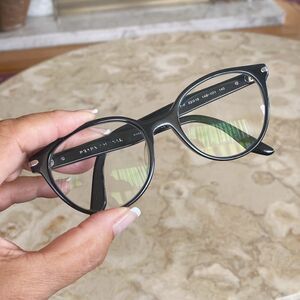 In excellent preowned condition classic PRADA black acetate glasses. Elegant and timeless design, they feature silver tone detail with the brand “PRADA” on the arms.