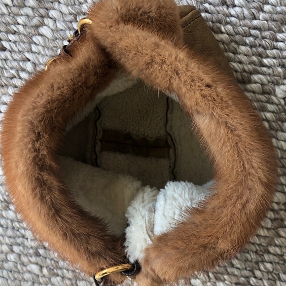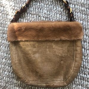 Gold-tone distressed leather body, crocodile shoulder strap, mink trim, creme shearling lining with gold-tone hardware, logo placard at front face, and snap closure at top.