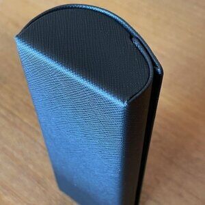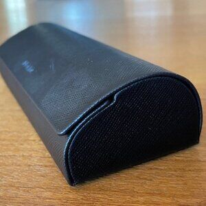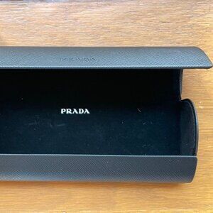 Made in Italy, these authentic Prada eyeglasses and original case are in excellent condition as per photos. The ergonomic frame design is a fashion statement and the integrated nose bridge and pad ensure comfort. The color of the frames is a translucent amber-brown, and there are minimal signs of wear on either the acetate or metal. The lens socket width is 52 mm., bridge width is 16 mm., and temple length is 135mm. The hard, textured black case is a clam-shell style with a black velvet lining and a silver PRADA logo. The original large cleaning cloth was probably never used and is included. I have tried to accurately describe and show the exact condition of the frames and the case, and any blemishes are clearly shown in the photos. The price includes frames, case, and cleaning cloth. Compare my asking price for all 3 pieces with other listings online.