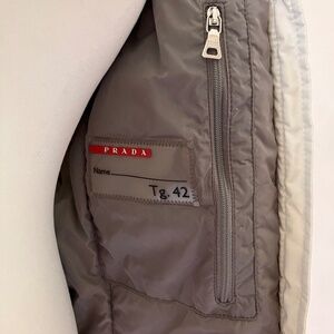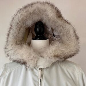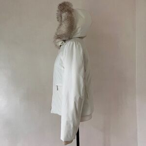 EXCELLENT condition and straight from the dry cleaner’s, stunning white PRADA GORE-TEX ski jacket in Size 42, natural white fox fur from Finland, detachable hood, all zippers, snaps engraved with PRADA, zippered inner pocket, snap and button closure at the neck for extra protection, durable fitted cuffs, red PRADA logo at the cuff, built-in PRADA lanyard in the pocket, Made in Italy 🇮🇹