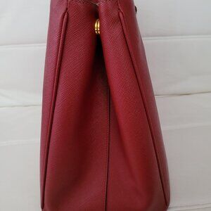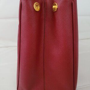 PRADA Large Saffiano Lux Galleria Tote - Rubino color with gold-tone hardware and dual rolled top handles, snap expansions on both sides.
