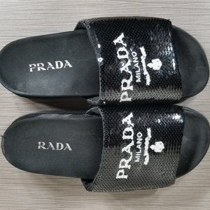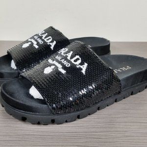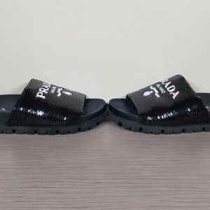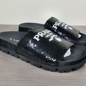 PRADA Logo Sequin Slide Sandal, Black, Womens Size 7.5US / 37.5EU