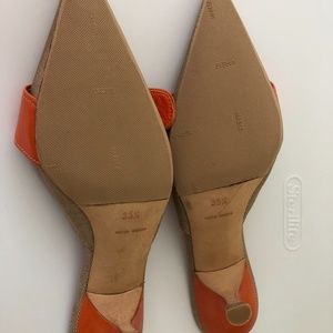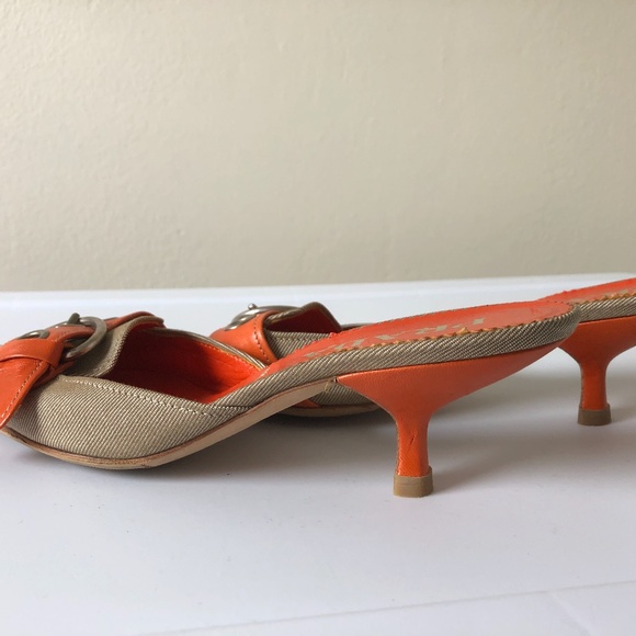 Beautiful Prada kitten heel mule. Taupe with orange leather strap, heel and insole. Silver buckle and grommets. Made in Italy. Topeys on the sole to provide cushion comfort and to prevent slipping. NEVER WORN.