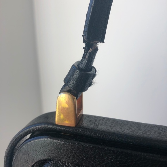 Black, grained leather with gold-tone hardware, rolled leather top handles and a hanging clochette, push lock closure, fabric logo lining with zip wall pocket. Very good condition. One side of handle is frayed (see image 5).