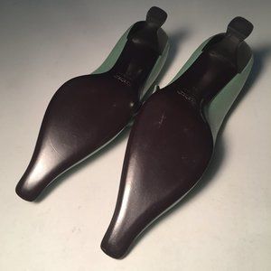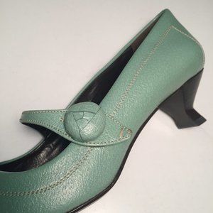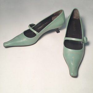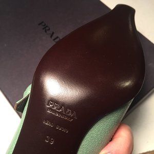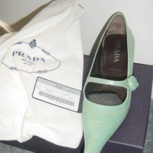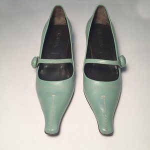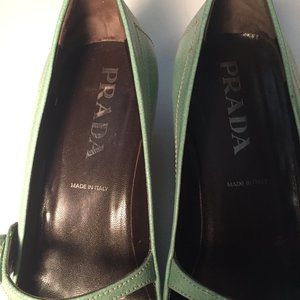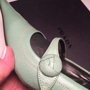 Gorgeous, never-worn, authentic PRADA Calzature Donna Cinghiale shoes made in Italy. Size 8. Made of boar leather. Lovely seafoam green colour or Giada. They have a leather flower button at the side. They come with the original box and white Prada dust bag.
