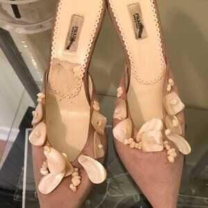 Stunning pink buttery soft suede mules with pointed toe and 3 inch stiletto heels embellished with iridescent genuine shells