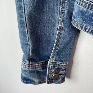 PRANA Cropped Jean Jacket Blue Medium Wash Denim Stretch Crochet Flower Pin S
