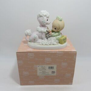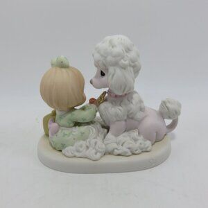 This charming figurine from Precious Moments captures a tender moment between a young girl and her fluffy poodle, showcasing meticulous craftsmanship and attention to detail.