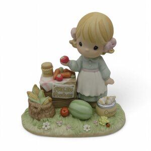 This Precious Moments figurine features a charming design, showcasing a girl with fresh produce.
