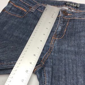 3104 LIKE NEW CONDITION !! PREMIUM HEAVYWEIGHT DENIM !! CONTRASTED COPPER COLORED DOUBLE STITCHING !! CLASSIC 5-POCKET STYLE !! 9โ FLARE WIDE LEG !! INLAY CRYSTAL DETAIL ON POCKET RIVETS ๐ NOT ALTERED !! 8.5โ MIDRISE !! VINTAGE QUALITY DENIM and COOL BRITISH DESIGNED style ๐