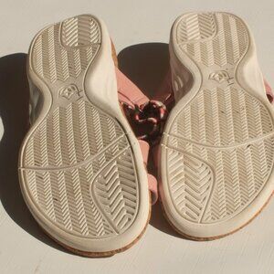 Not worn. Tried on a few times. Small sticker residue near the logo on the foot bead of the right sandal.