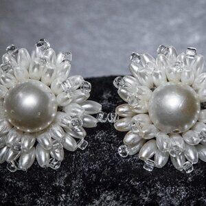 PRETTY Vintage Faux Pearl and Clear Beads Cluster Style Earrings CLIP ON