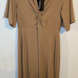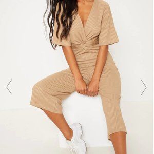 "This jumpsuit features a deep stone ribbed material, a culotte leg fit and a twist detail on the front.