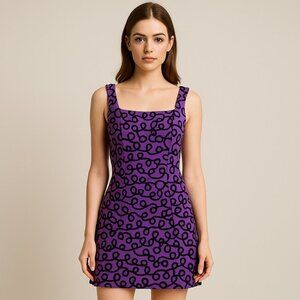 Flirty and bold Betsey Johnson mini dress in vibrant purple with a unique black swirl pattern. Features thick straps, a flattering bust seam, and a fitted silhouette.