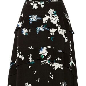 Proenza Schouler skirt is printed with pretty blue and emerald green flowers. this lightweight Silk-jeorgette design is crafted with tiered ruffles and asymmetric hem that flutters as you walk.
