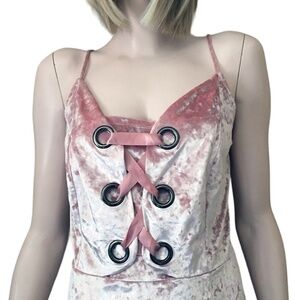 Features: Gorgeous pink crushed velvet, silver grommet lace up criss cross detail at front, Adjustable spaghetti straps, Panel front, Empire bodice at back, Defined waistline at front, Invisible side zipper with additional hook & eye closure, Bonded polyester lining, Super soft textile, Lots of stretch to fabric